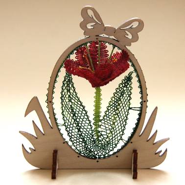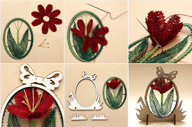 die inneren Blütenblätter annähen. Staubblätter in die Blüte einnähen. Klöppelarbeit auf den Rahmen legen und mit Perlonfaden