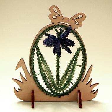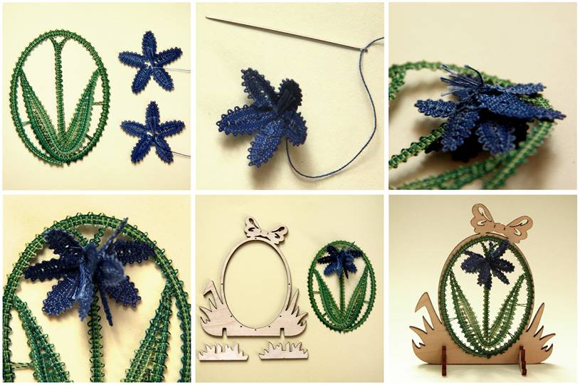 Klöppelarbeit auf den Rahmen legen und mit Perlonfaden einnähen oder mit Microklebepunkten fixieren.