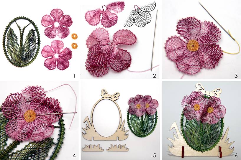 5 Klöppelarbeit auf den Rahmen legen und mit Perlonfaden einnähen oder mit