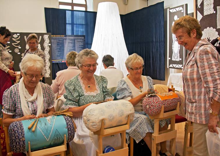Schauklöpplerinnen saßen bereit, um den Gästen ihr Handwerk zu zeigen.