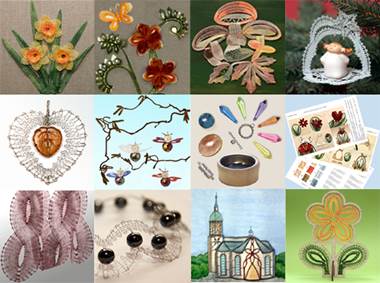 Klöppelbriefen auch neue Ideen, z.B. Klöppelschmuck aus Draht, Einsätze für Holzrahmen,
